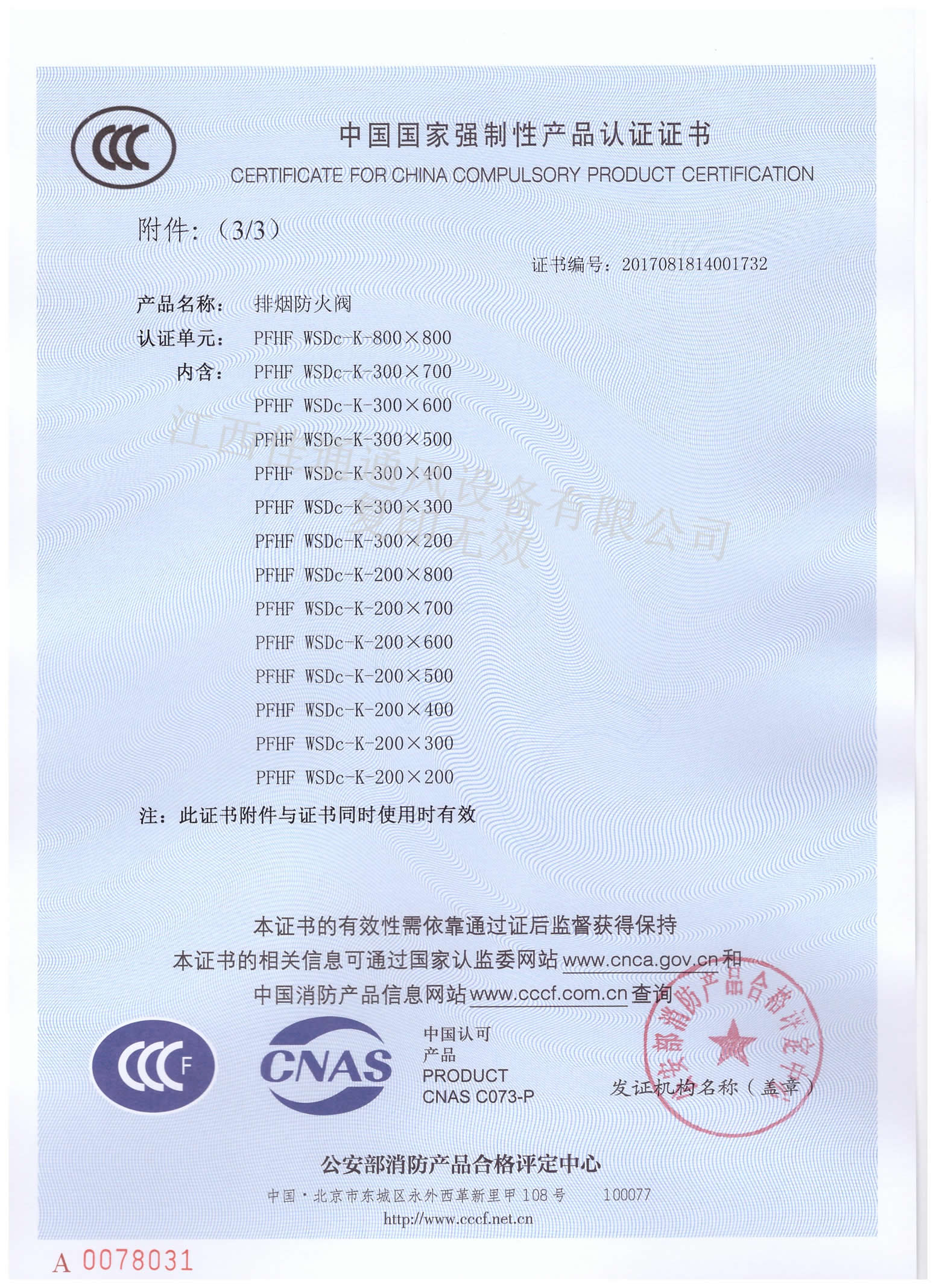 下一条:消防3C认证证书排烟防火阀800×800(分型2)