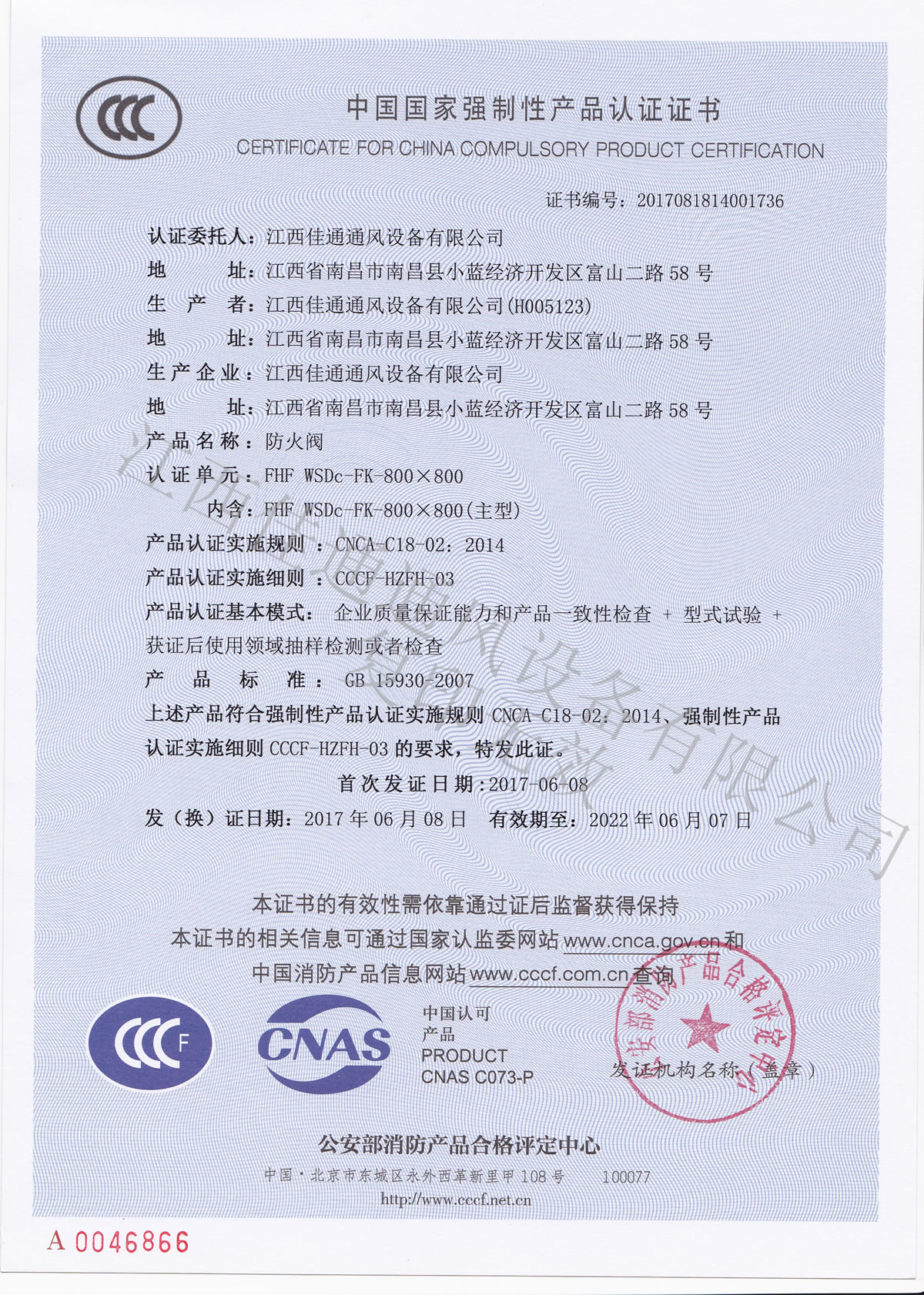 下一条:消防3C认证证书排烟防火阀800×800(分型3)